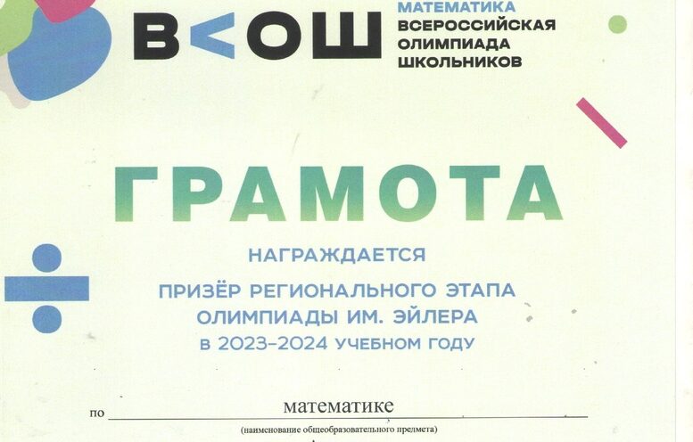 ✅ Призёр Регионального этапа Олимпиады им.Эйлера в 2023-2024 учебном году по математике