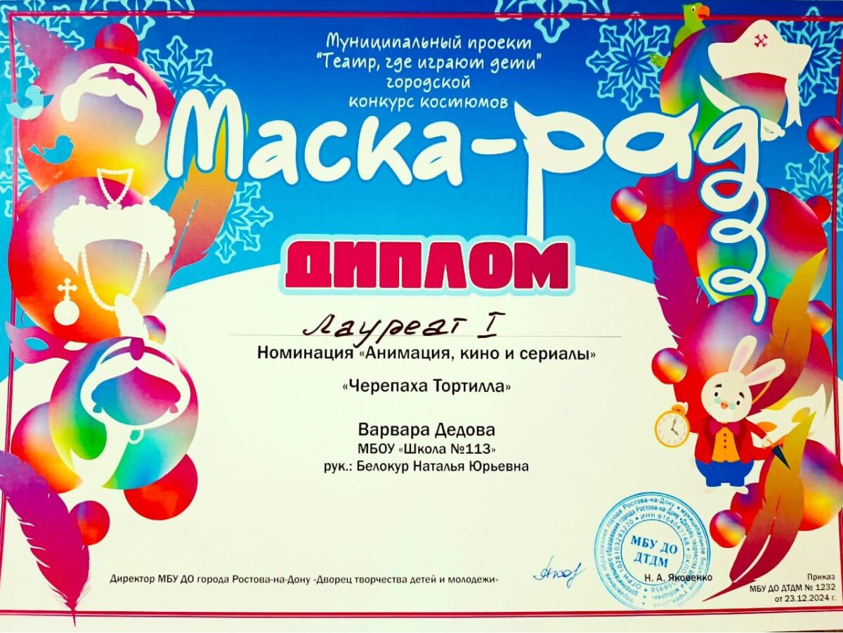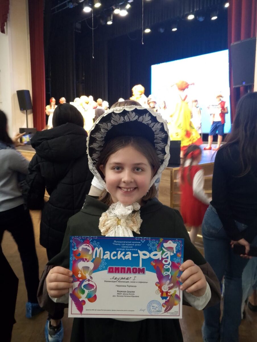 17 января во Дворце творчества детей и молодежи Ростова-на-Дону в рамках муниципального проекта «Театр, где играют дети» состоялся городской конкурс костюмов «Маска-Рад 2025» нашу школу представляла Дедова Варвара, ученица 4 «Б» класса и стала лауреатом I степени.
